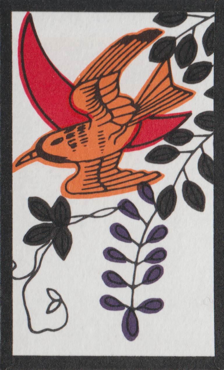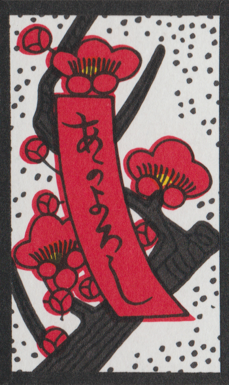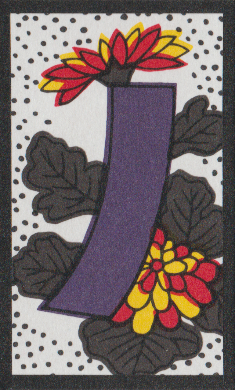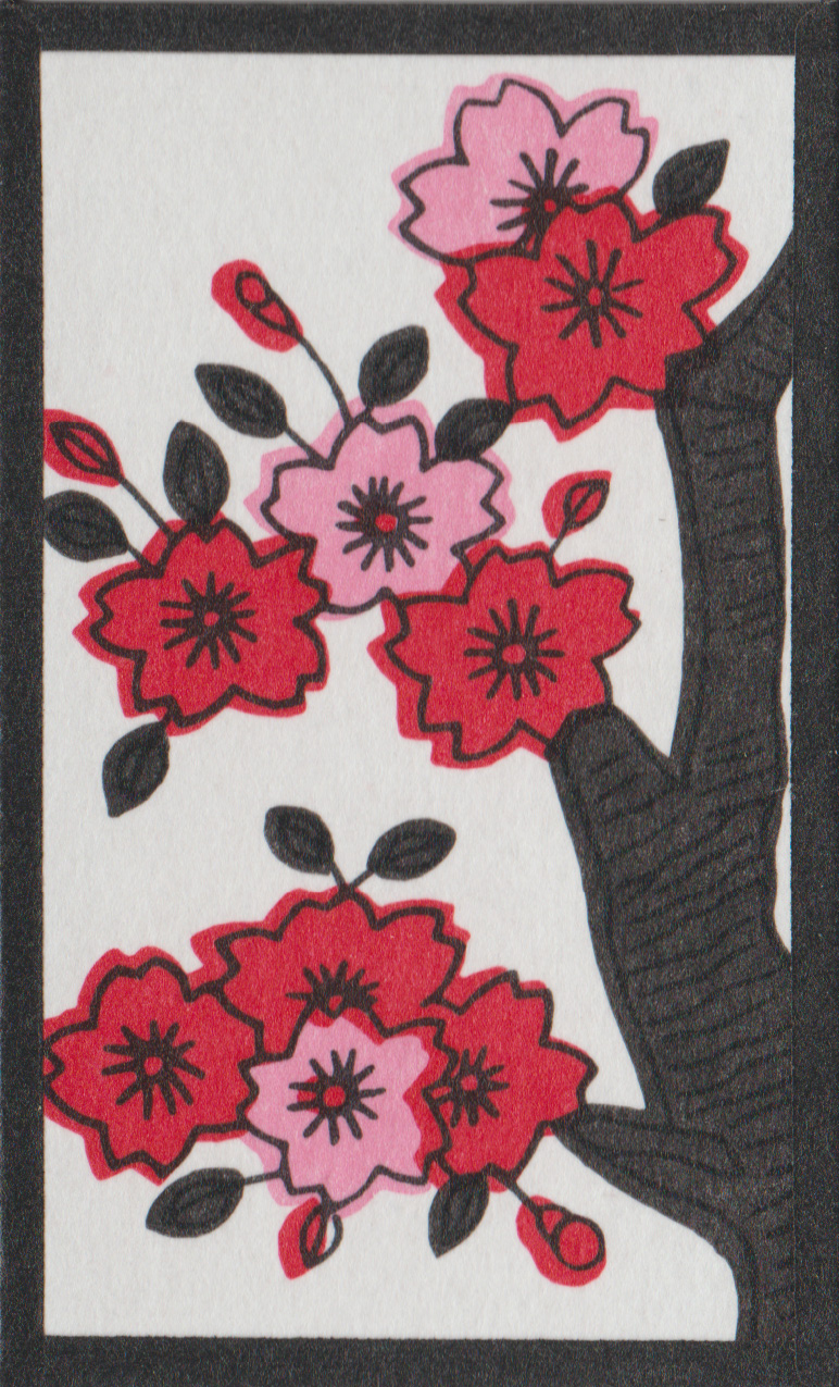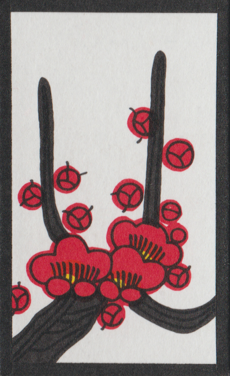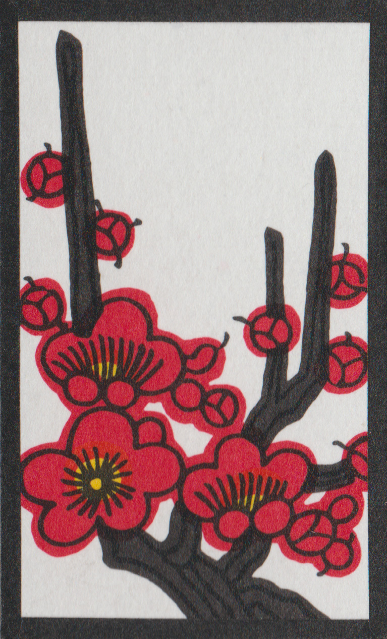 A deck of Hanafuda is made up of 12 flower suits (called “hiki”), with 4 cards in each suit. Every suit is a flower or plant that represents one month of the year. January is the Pine Tree, February is Plum Blossoms, March is Cherry Blossoms, etc..