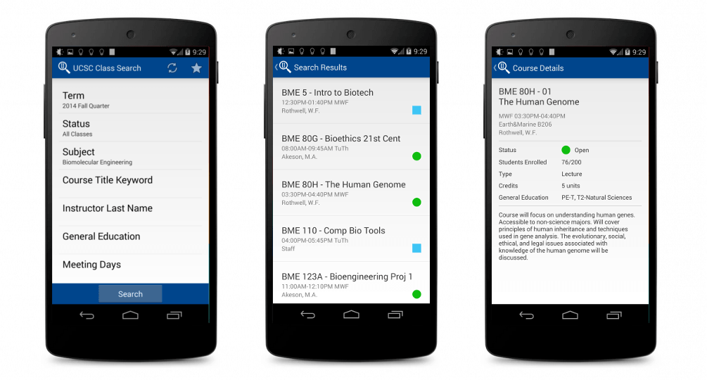 UCSC Class Search is an Android app that allows students to browse course listings at University of California, Santa Cruz. It was created for the CMPS 121: Mobile Applications course at UCSC. It pulls data from the public UCSC course browser and displays it in a conveniently formatted mobile app. I designed and implemented the user interface, and I wrote the netcode, including the HTML parsing code.